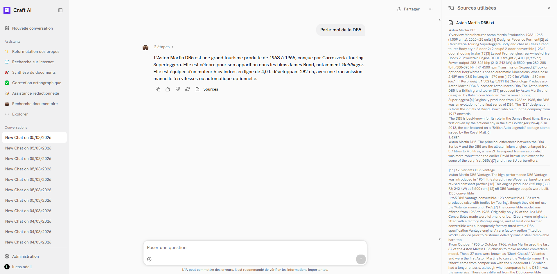 Cette application permet au modèle d’enrichir sa réponse en allant chercher directement des informations sur Internet. Les sites utilisés comme sources par l’application sont ensuite affichés en dessous de la réponse.