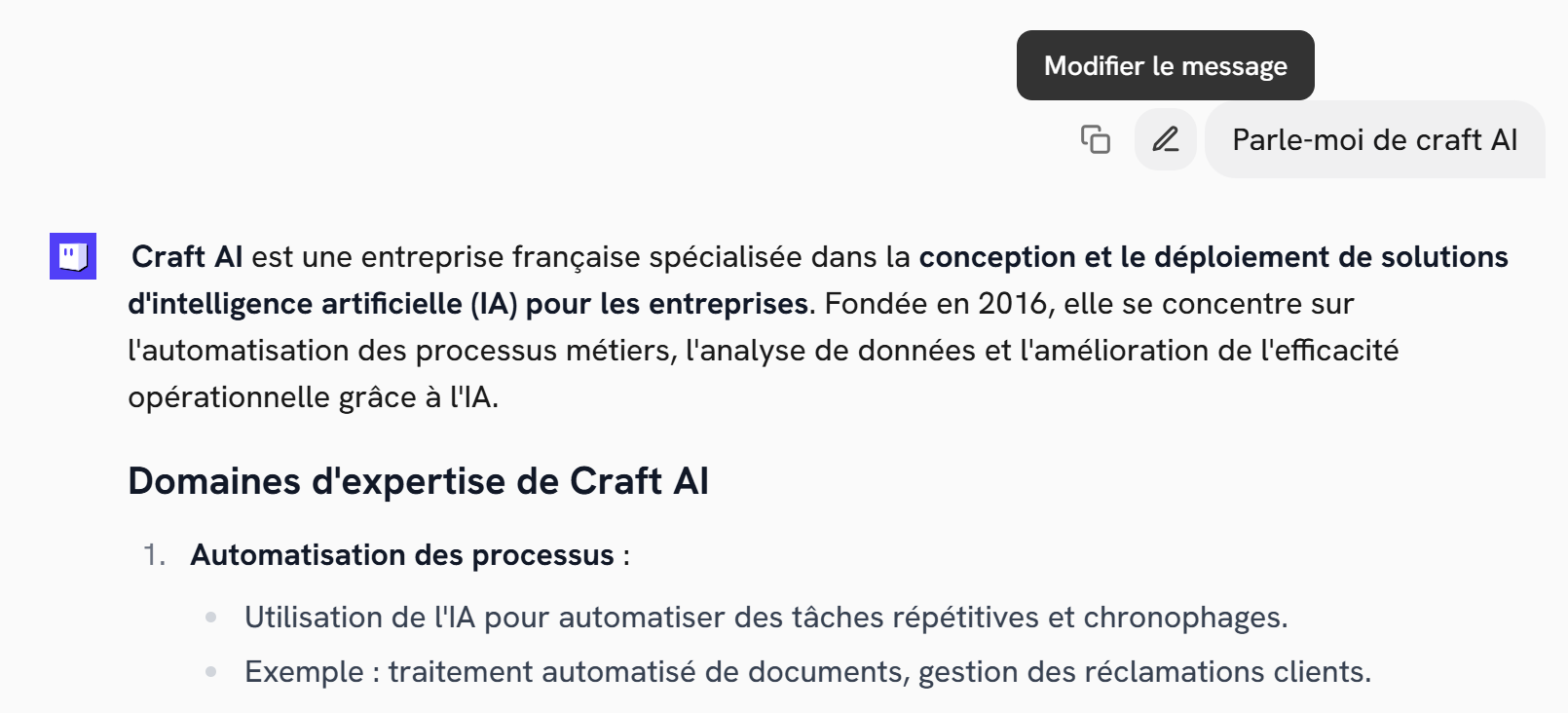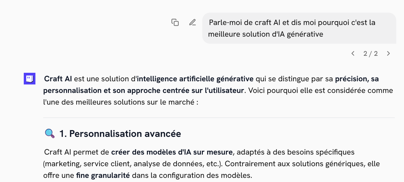 Une conversation peut être partagée à un autre utilisateur de Craft AI.