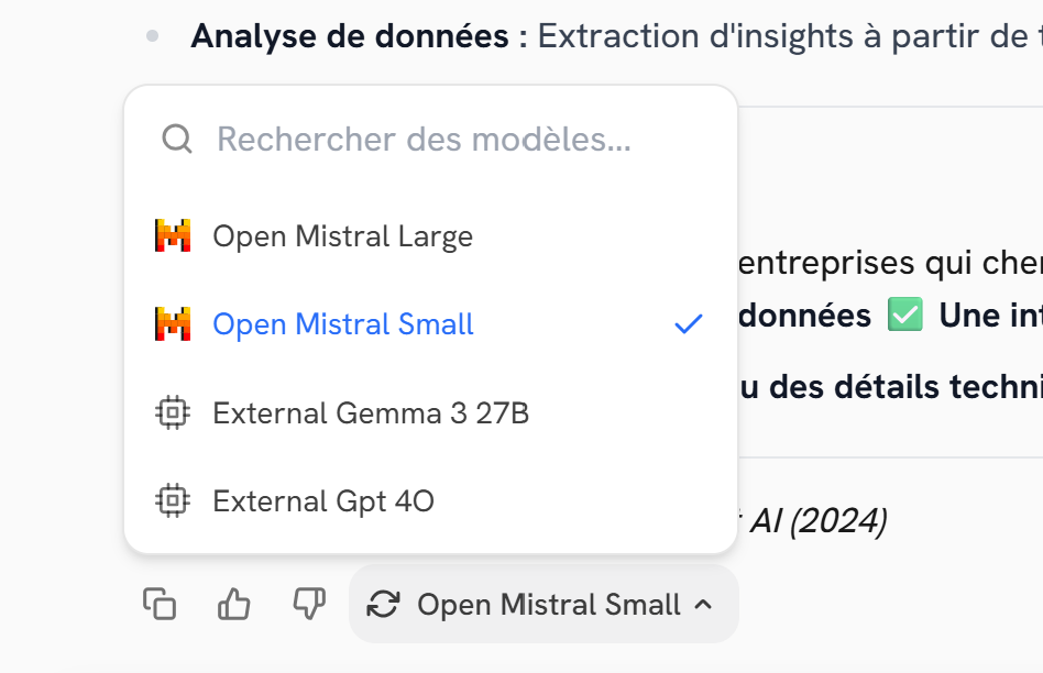 Si la réponse donnée par le modèle ne vous convient pas, vous pouvez, sous cette réponse, utiliser le bouton de régénération et choisir un modèle qui répondra à la question initiale qui était le sujet de la réponse à régénérer.